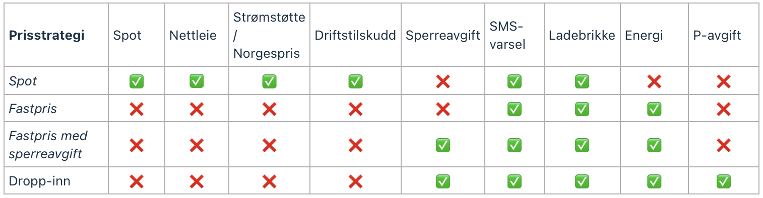 Nedenfor ser du hvilke priselementer som støttes med de forskjellige prismodellene. Dropp-inn støtter ikke Spotpris, men fastpris.